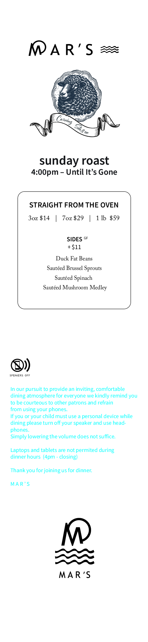 holiday toast One of the following Brut Tradition, La Taille Aux Loups, Chenin Blanc, Loire, France, NV Sparkling Yuzu (Non-Alcoholic) White Tea, Rosehip Cordial first course One of the following LOBSTER BISQUE GF Chives, Cream, Squid Ink CHARRED ROMAINE GF Walnuts, Panko Bread Crumbs, Lemon-Parmigiano Dressing second course One of the following SMOKED TROUT MOUSSE Trout Roe, Lemon Zest, Baguette PAN-SEARED SCALLOP GF Cauliflower Purée, Peas , Squid Ink, Sage, Brown Butter ROASTED FENNEL GF Burrata, Green Olives, Chili Oil MUSHROOM RAVIOLI Ricotta, Black Truffle, Sage Brown Butter DUCK CONFIT GF Baby Lima Beans, Spinach, Lemon Zest CARPACCIO GF Raw Filet Mignon, Arugula, Fried Capers, Lemon Zest, Parmigiano third course One of the following SAFFRON RISOTTO GF Asparagus, Peas, Arugula, Year Year Parmigiano Reggiano, Lemon Zest BLACK SEA BASS GF Seared Bass, Swiss Chard, Trumpet Mushrooms, Fish Broth, Chili Oil BRAISED RABBIT LEG GF Potato Purée, Button Mushrooms, Cipollini Onion FILET MIGNON* GF Potato Gratin, Escargot Butter, Sautéed Broccolini Add Lobster Tail +$39 WHOLE LOBSTER GF Cold or Warm 1¼ lb Maine Lobster, Asparagus, Garlic-Herb Butter dessert One of the following CRÈME BRÛLÉE Amaretto, Burnt Raw Sugar PAVLOVA Meringue, Mixed Berries, Whipped Cream CHOCOLATE MOUSSE CAKE Cocoa, Cream, Whipped Cream RAW CHEESE RAW HONEY Stichelton, (Cow), UK, Dried Figs, Pecans, Baguette sides +14 Each ASPARAGUS Balsamic Reduction, Parmigiano BROCCOLINI Sautéed, Garlic, Olive Oil MUSHROOM MEDLEY Sautéed Beech, Trumpet, Hon-Shimeji, Maitake, Olive Oil LIMA BEANS Spinach, Duck FatSAGE FRIES GF Hand-Cut Potatoes, Sage, Peanut Oil