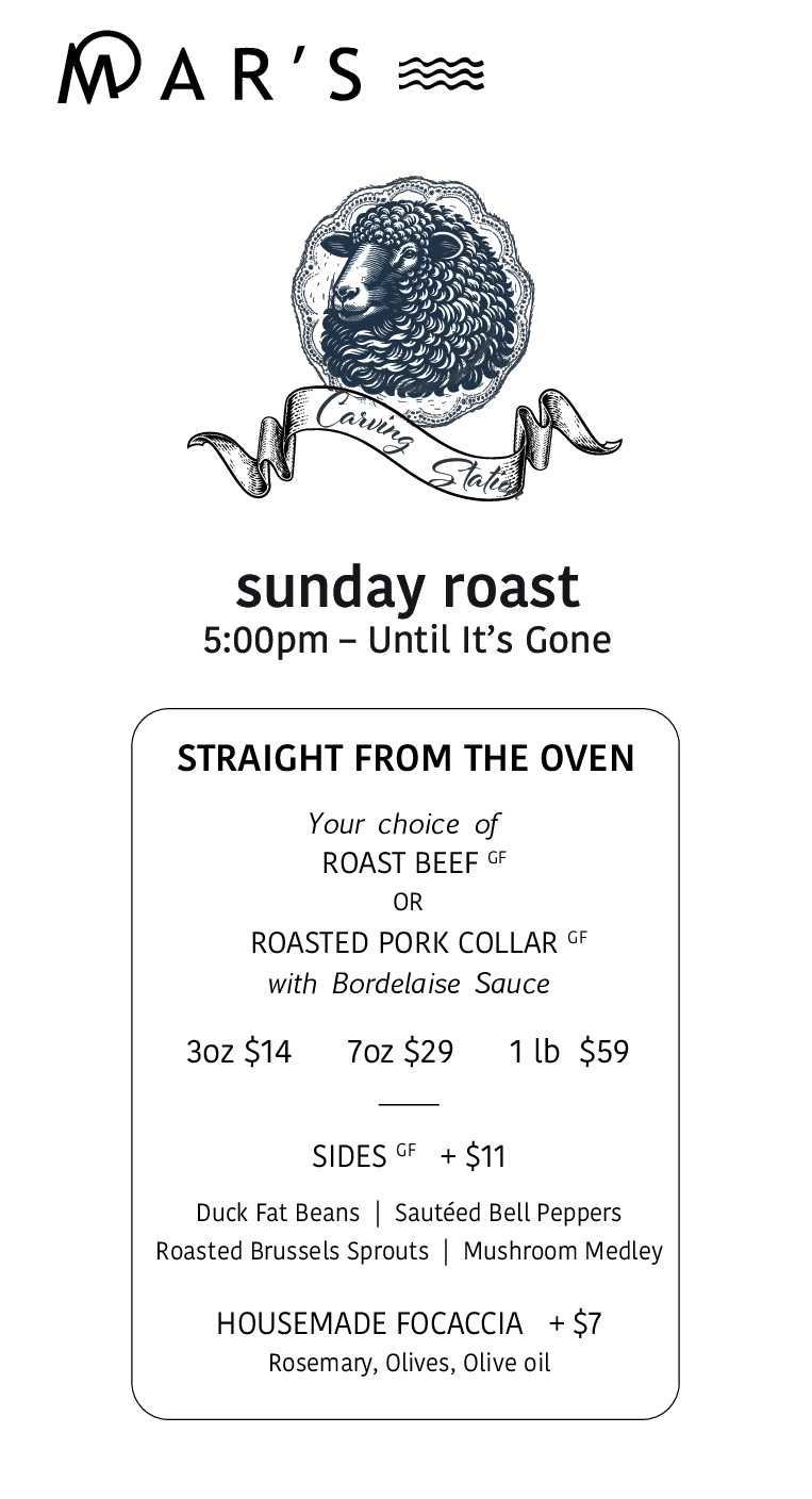 holiday toast One of the following Brut Tradition, La Taille Aux Loups, Chenin Blanc, Loire, France, NV Sparkling Yuzu (Non-Alcoholic) White Tea, Rosehip Cordial first course One of the following LOBSTER BISQUE GF Chives, Cream, Squid Ink CHARRED ROMAINE GF Walnuts, Panko Bread Crumbs, Lemon-Parmigiano Dressing second course One of the following SMOKED TROUT MOUSSE Trout Roe, Lemon Zest, Baguette PAN-SEARED SCALLOP GF Cauliflower Purée, Peas , Squid Ink, Sage, Brown Butter ROASTED FENNEL GF Burrata, Green Olives, Chili Oil MUSHROOM RAVIOLI Ricotta, Black Truffle, Sage Brown Butter DUCK CONFIT GF Baby Lima Beans, Spinach, Lemon Zest CARPACCIO GF Raw Filet Mignon, Arugula, Fried Capers, Lemon Zest, Parmigiano third course One of the following SAFFRON RISOTTO GF Asparagus, Peas, Arugula, Year Year Parmigiano Reggiano, Lemon Zest BLACK SEA BASS GF Seared Bass, Swiss Chard, Trumpet Mushrooms, Fish Broth, Chili Oil BRAISED RABBIT LEG GF Potato Purée, Button Mushrooms, Cipollini Onion FILET MIGNON* GF Potato Gratin, Escargot Butter, Sautéed Broccolini Add Lobster Tail +$39 WHOLE LOBSTER GF Cold or Warm 1¼ lb Maine Lobster, Asparagus, Garlic-Herb Butter dessert One of the following CRÈME BRÛLÉE Amaretto, Burnt Raw Sugar PAVLOVA Meringue, Mixed Berries, Whipped Cream CHOCOLATE MOUSSE CAKE Cocoa, Cream, Whipped Cream RAW CHEESE RAW HONEY Stichelton, (Cow), UK, Dried Figs, Pecans, Baguette sides +14 Each ASPARAGUS Balsamic Reduction, Parmigiano BROCCOLINI Sautéed, Garlic, Olive Oil MUSHROOM MEDLEY Sautéed Beech, Trumpet, Hon-Shimeji, Maitake, Olive Oil LIMA BEANS Spinach, Duck FatSAGE FRIES GF Hand-Cut Potatoes, Sage, Peanut Oil